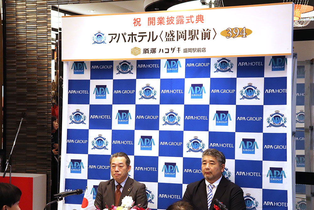 記者発表において、アパグループ社長 兼 最高経営責任者(CEO)の元谷一志は、「盛岡市初進出であり、岩手県内では新築ホテルとして初となるアパホテル〈盛岡駅前〉の開業を迎えることができ大変嬉しく思う。現在、当社は『選択と集中』戦略を進めており、盛岡は集中拡大エリアとしてすでに2棟目の用地も取得している。『アパホテルはラボである』を標榜し、トライ&エラーを繰り返しながら進化し続けており、当ホテルでは、火災、地震、津波などの緊急時の案内を客室のテレビ画面に5言語で表示するシステムの導入や浴槽またぎ用の手摺の設置など、お客様が安心・安全にご宿泊いただけるイノベーションを施している。盛岡駅周辺は多くのホテルがひしめく競争の激しいエリアであり、最後発での出店となるが、地域と共存共栄し、地元の皆様からも愛されるホテルを目指していきたい。」と述べた。