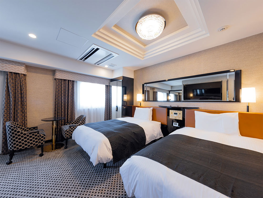 客室数 | 全261室(全室禁煙) ・シングルルーム 132室(1,400mm幅 / 1ベッド) ・ダブルルーム 36室(1,400mm幅 / 1ベッド) ・コネクトルーム 33組66室(1,400mm幅 / 2ベッド / 最大4名まで利用可能) ・コージールーム 21室(1,400mm幅 / 1ベッド / ソファ付) ・DENBA空間ルーム 3室(1,400mm幅 / 1ベッド) ・デラックスツインルーム 3室(1,200mm幅 / 2ベッド) |