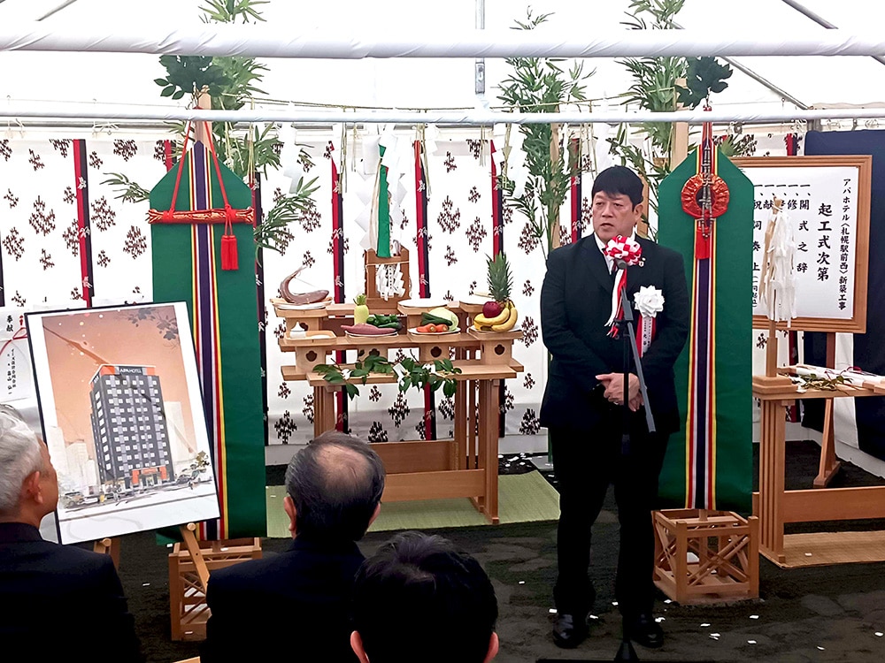 神事後の挨拶において、アパマンション株式会社 代表取締役 元谷 拓は、「本日、アパホテル〈札幌駅前西〉の起工式を執り行うことができ嬉しく思う。札幌の新築工事においては分譲マンションの建設から始まり、本年7月にはアパホテル&リゾート〈札幌駅前〉の起工式を行った。また既存ホテルのスクラップ&ビルドにより、来月12月18日にアパホテル〈札幌大通駅前西〉が開業を迎えることになる。政令指定都市である札幌市は、大通やすすきのといった人気エリアを有し、新千歳空港からのアクセスも良い。人も街も建築技術も進化していく。イノベーションポイントを取り入れて、より良い環境対応型のホテルとなるよう努めたい。訪れたお客様に「価値ある称賛」を頂き、このホテルがあって良かったと言われる建物となるよう、無事故・無災害で竣工を迎えたい。」と述べた。