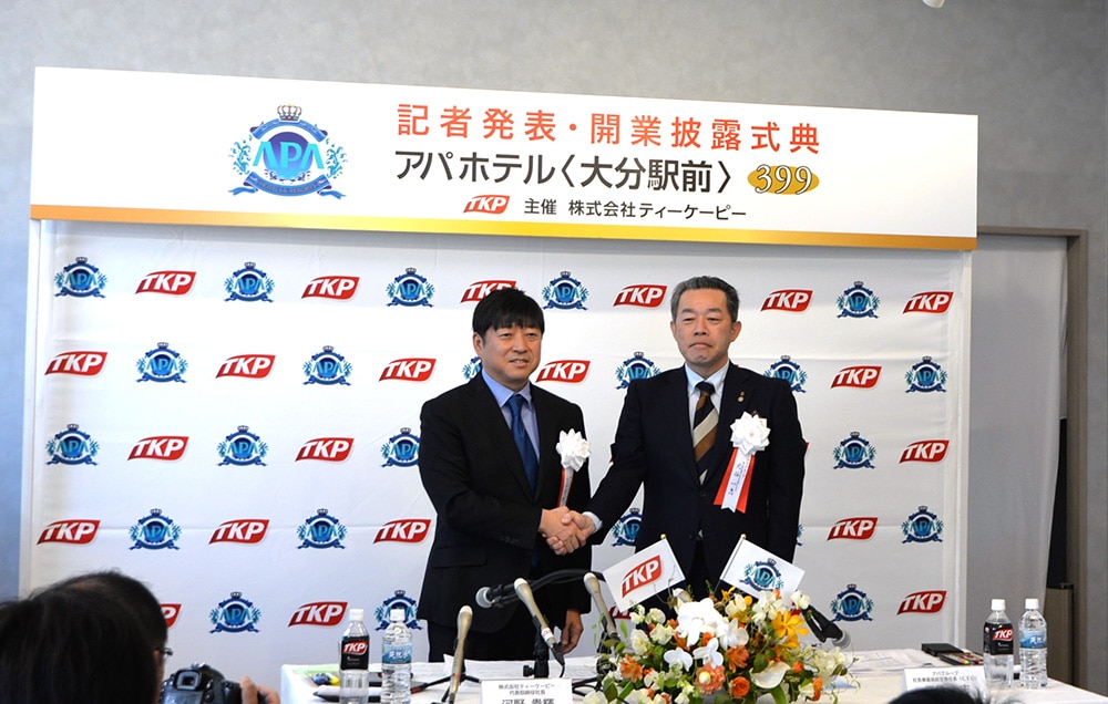 開業記者発表にて、アパグループ社長 兼 最高経営責任者(CEO)の元谷一志は、「ティーケーピー創業20周年の年に、同社のアパホテルフランチャイズ運営20棟目を開業されたこと、嬉しく思う。県都大分市で初のアパホテルとなったが、アパ創業で人口が同規模の金沢市では複数出店しており、河野社長には大分市で更なる出店に期待したい。大分県はグルメ、温泉や観光資源が豊富で、訪日外国人にも人気が高い。本ホテルの開業に伴い、大分経済を盛り上げていくと共に、ティーケーピーが展開する事業とのシナジーを活かして当社も事業を行っていきたい。」と述べた。
