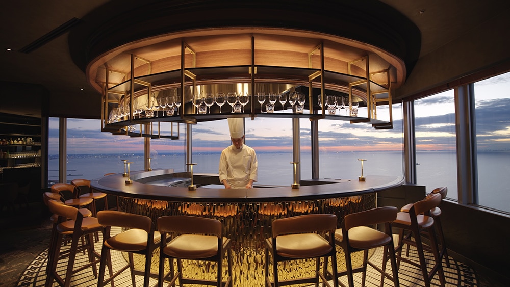 「空と海に囲まれたレストラン」をコンセプトに生まれ変わった店内には、東京湾に浮かぶ煌めく夜景を一望できるラグジュアリーなラウンジエリアを新設。大切な方との時間を周囲を気にせずゆったりとお過ごしいただけるよう、洗練されたデザインのプライベートダイニング(個室)を5室完備。シェフの鮮やかな手捌きを楽しむ非日常の舞台が、春の「新たな門出」を祝う特別な席にふさわしい空間を提供する。