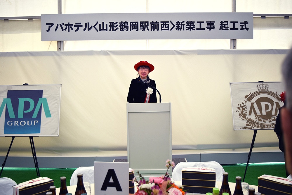 直会の挨拶において、アパホテル株式会社 取締役社長 元谷芙美子は、「この度、運営中のアパホテル〈山形鶴岡駅前〉(137室)に続き、市内2棟目となるアパホテル〈山形鶴岡駅前西〉(300室)の起工式を迎えられたことを嬉しく思う。2棟合計437室、本計画では大浴場、レストランも予定しており、お客様に愛されるホテルとしていきたい。鶴岡市は伝統を大事にしながら産業面でも雇用を支えており、伝統と革新というのはアパホテルのイーブンベターという考えと合っている。無事故無災害で建築を進め、一日も早くホテル開業することで、地域に貢献していきたい。」と述べた。