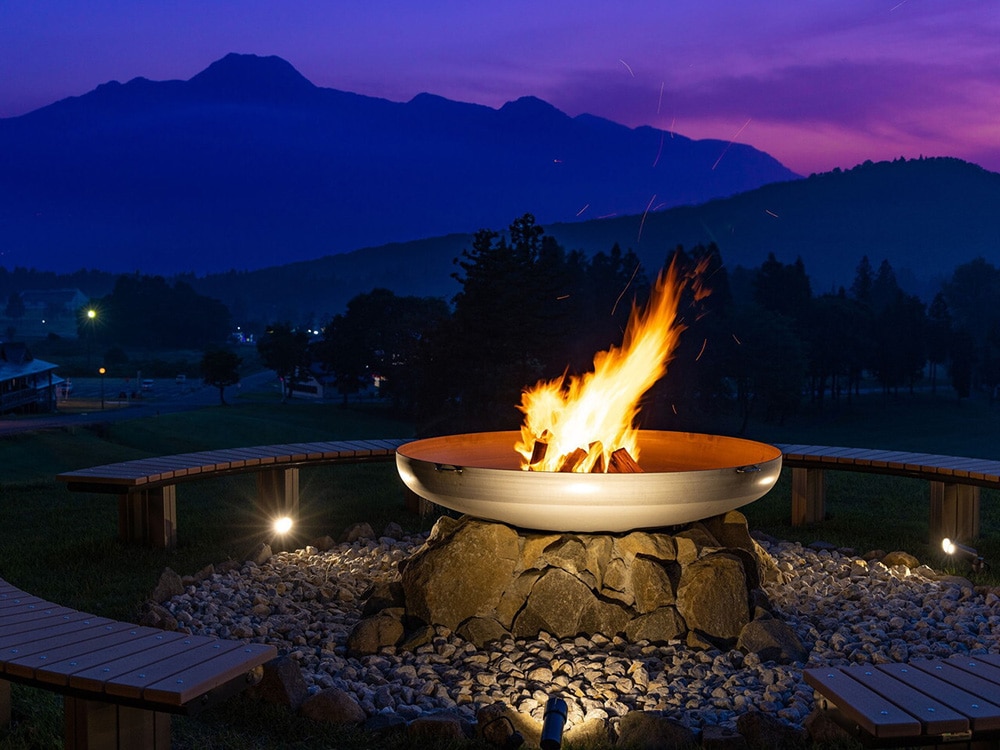 | ヒルサイドデッキ | 妙高連峰が見渡せる眺望豊かなエリアに焚火を設置。焚火を囲みながら大自然を体感 |