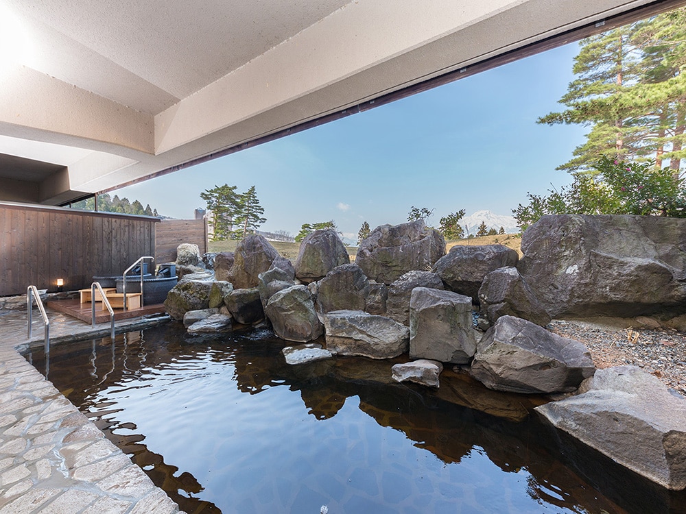 | 大浴殿・露天風呂 | 温泉露天風呂とサウナも完備の大浴場。雄大な妙高山を望みながら極楽のひと時を |